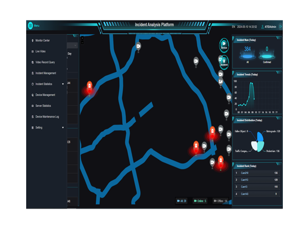| Traffic event data display | Traffic event data can be previewed on a 2D electronic map. The location and status of event detection devices and real-time traffic event alarms are displayed on the electronic map. Displays incident data, images, and live video using alert deployment icons on the electronic map |